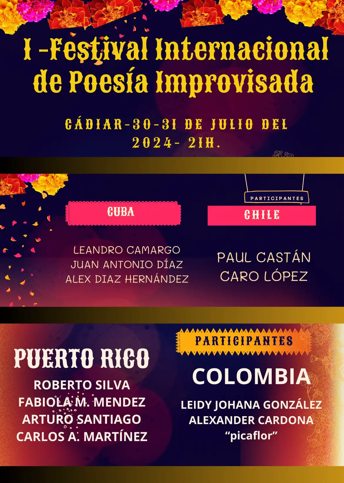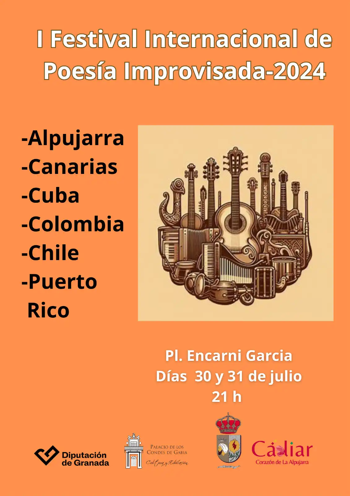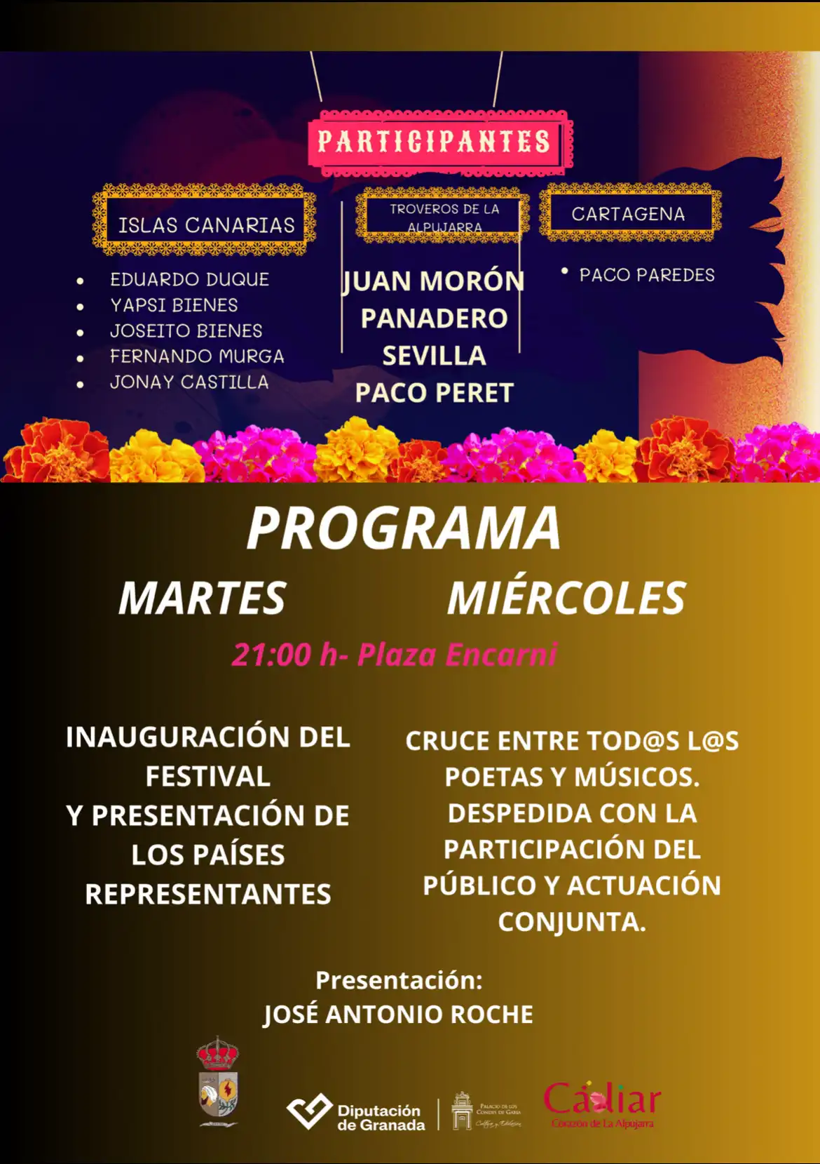 I FESTIVAL INTERNACIONAL DE POESÍA IMPROVISADA DÍAS 30 y 31 de Julio del 2024 Plaza Encarni García- Cádiar- 21 h ¿Qué es la poesía improvisada? Es la magia de las palabras tejida al instante, donde los versos fluyen como ríos y las emociones se entrelazan en un baile poético. En este festival, poetas de todo el mundo se unirán para compartir sus creaciones espontáneas y cautivar nuestros corazones. Versadores, repentistas, trovadores, payadores, y troveros tendrán su lugar de encuentro en Cádiar. Programa del festival • Ronda de Apertura: Palabras de bienvenida y presentación de los poetas. • Batalla de Versos: Dos poetas se enfrentarán en una competencia amistosa de improvisación poética. • Recital de Poemas: Disfruta de las creaciones más inspiradoras de nuestros invitados especiales. • Cierre con Estrellas: Una sorpresa poética para despedirnos. Participantes Internacionales: Nuestros poetas provienen de todos los rincones del mundo. Desde la Alpujarra hasta las calles de Colombia, Puerto Rico, Cuba, Chile, Canarias, y Cartagena, sus voces se unen en un coro universal de poesía. ¡BIENVENIDOS a nuestro emocionante FESTIVAL DE POESÍA IMPROVISADA INTERNACIONAL